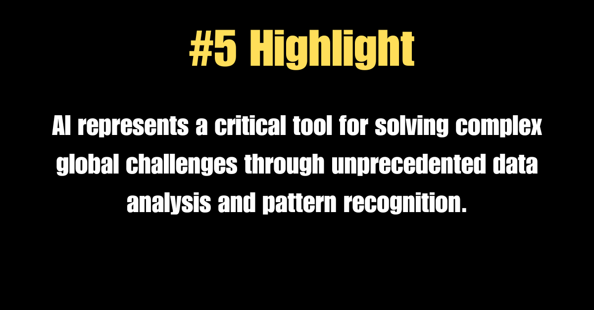 The ability of AI to process and analyze massive datasets allows it to identify patterns and solutions that might be invisible to human observers. This capability becomes particularly valuable when addressing complex global challenges that require understanding intricate relationships between multiple variables. By leveraging AI's analytical capabilities, we may find breakthrough solutions to problems that have long resisted traditional approaches.