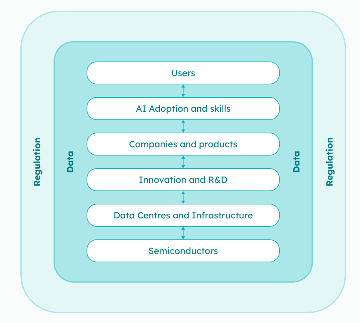 At the heart of the strategy sits the “AI Stack”, a model of eight interconnected layers that represent everything needed for a healthy AI ecosystem. These layers aren’t ranked by importance; they all depend on each other. Data and Regulation are shown as “encircling” layers, sitting around and within all other layers.