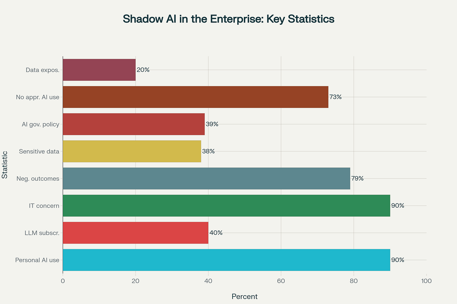 These numbers underline a critical reality: shadow AI is not a fringe activity. It is already a core part of workplace behavior.