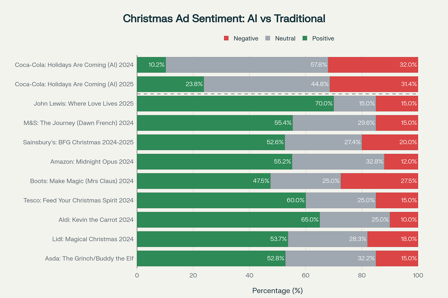 It worked. The sentiment data is clear: traditional Christmas ads dramatically outperformed AI ads emotionally in 2024–2025.