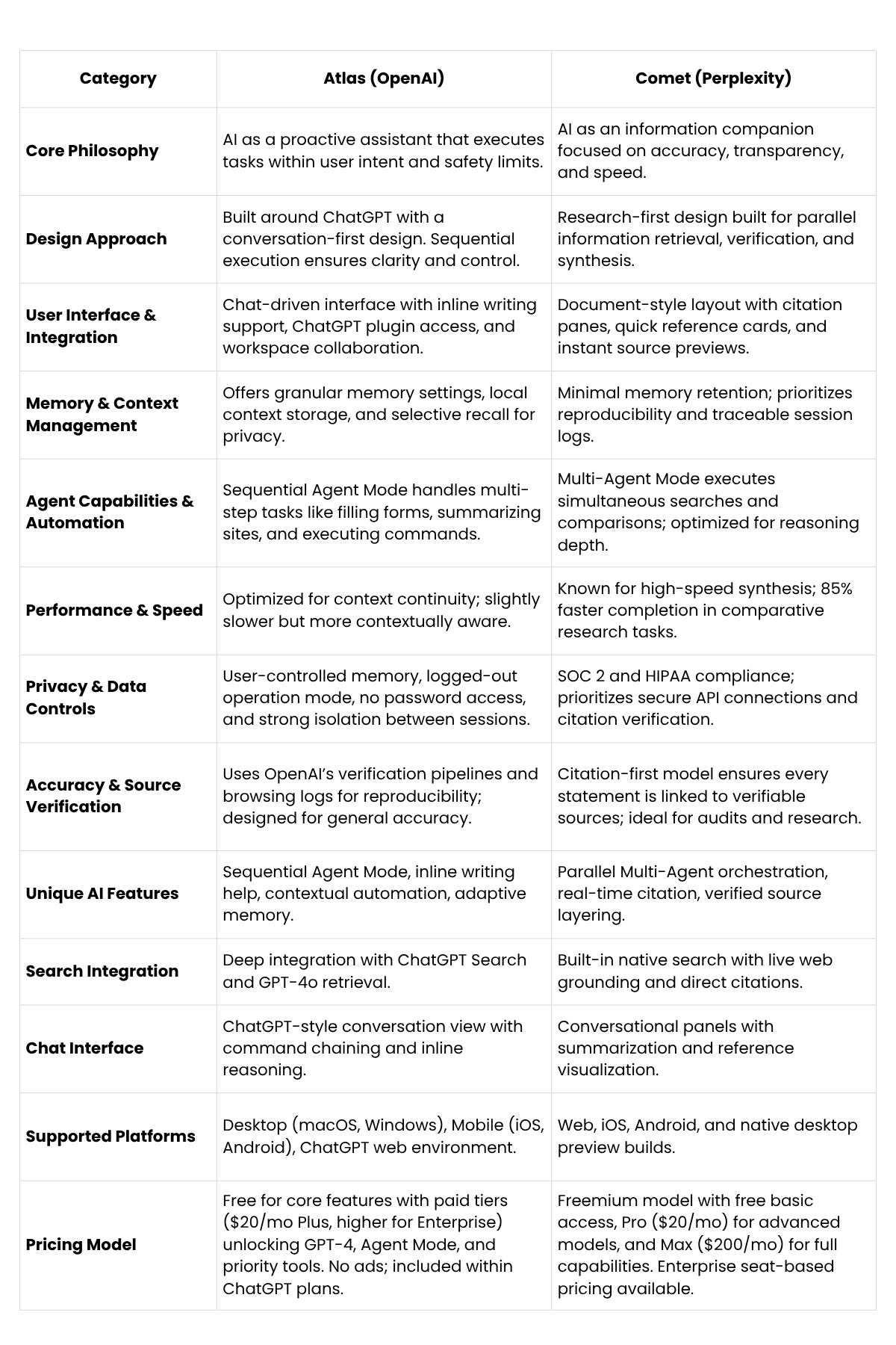 By the end of the year, both browsers had defined their territory: Comet led on speed, verification, and enterprise readiness, while Atlas focused on privacy, integration, and conversational control. The battle for the “front door to the internet” had officially begun.